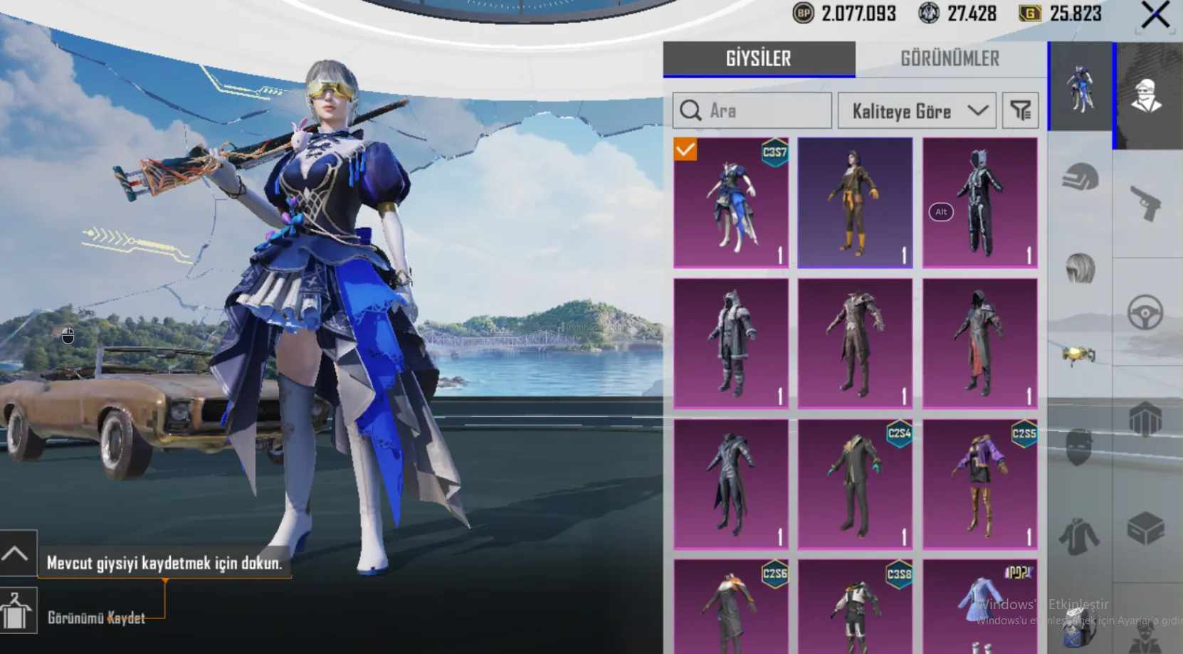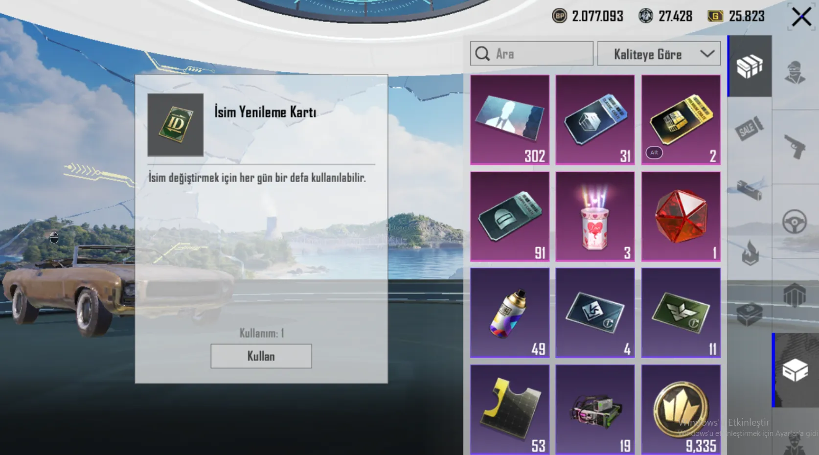 • Envanterde; 1 Destansı Amblem + 31 Adet Klasik Sandık Kuponu + 91 Adet Malzeme Sandığı Kuponu + 2 Adet Premium Sandık Kuponu + 9300 Sezon Jetonu + İsim değiştirme Kartı + 2 Milyon 70 bin BP + 25.800 G MEVCUTTUR!
