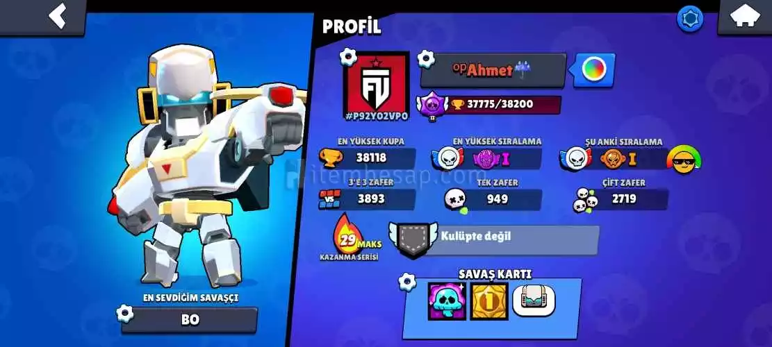 72 karakter vardır hesapta Hesap 37000+ kupa alan kişi pişman olmaz gayet güzel sadece 7 karakter eksik kupa kasmaya başladınızmı rahat 50000 kupa olacağınız bi hesap alan kişiye şimdide hayırlı olsun hayırlara karşı kullansın.