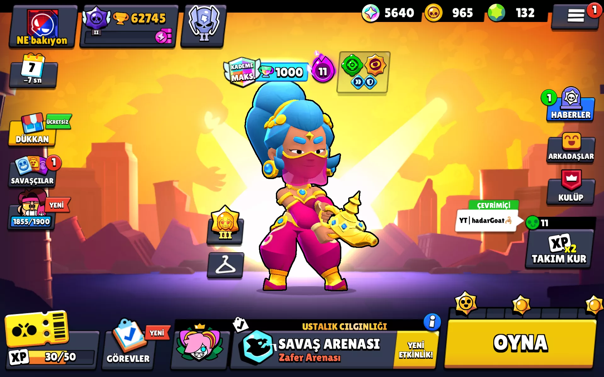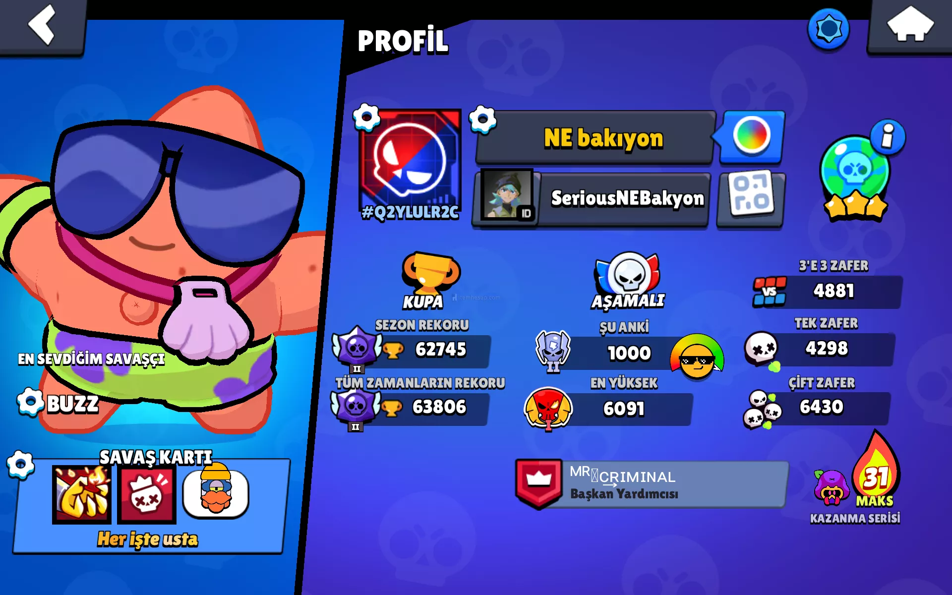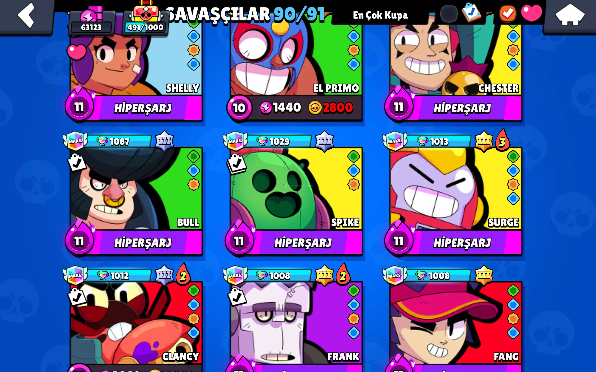 Hesap 63 k dır. Çok dayıda nadir kostüm ve Rozet mevcuttur.12 tane karakter ünvanı açıktıtir.Efsanevi ligine çıkılmıştır.90 karakter açıktir.( 91. Karakterin açilmasına 190 kredi kaldı).2 kere brawl pass alınmıştır.