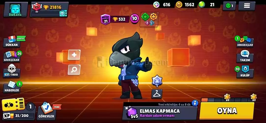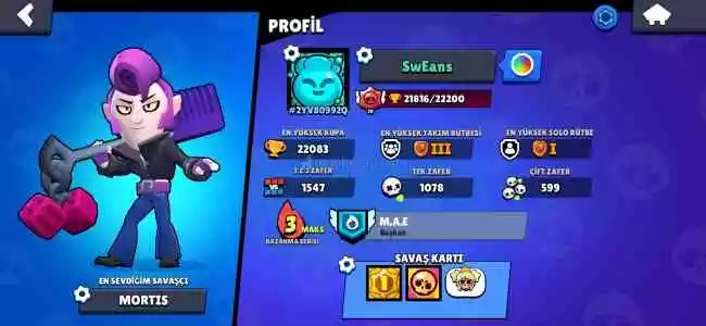 Brawl stars hesabında 56 karakter, 35 yıldız gücü, 5 efsane karakter, 34 kostüm vardır. Kupa 21816'dır