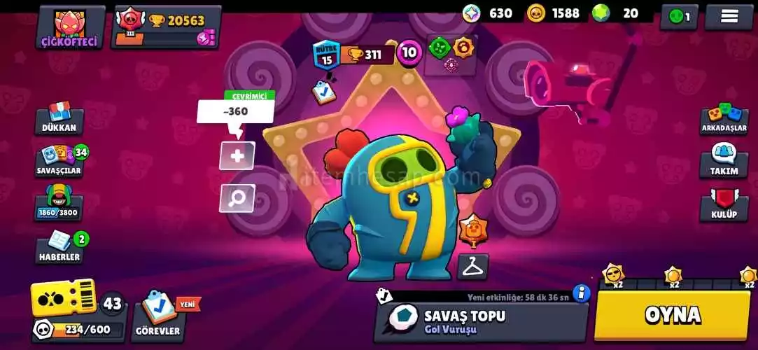 Hesap 20.573 dır içinde 14 tane kostüm var kundakçı spike hayalet sqweak ve sokak ninjası tara gibi güzel kostümler bulunmaktadır içinde 19 adet 20 rütbe karakter vardır hesapta 56 karakter vardır brawll pass 44 kademe kadar ilerlemiştir hesap süpercell ıd ye bağlıdır isim değiştirmek için yeterli Elmas bulunmamaktadır