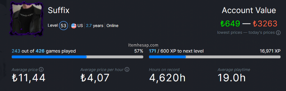 Detaylı bir şekilde hesabı görüyorsunuz. 2500 tlye bırakıyorum fiyatı hakkında konuşmak için bana yazabilirsiniz. Bu ay  paraya ihtiyacım var diye satıyorum ilginiz ve baktığınız için teşekkürler 3 yıllık bir hesaptır gerçekten çok emeğim var hesapda pubg hariç tüm popüler oyunlar var oyunları detaylı görmek isterseniz steam hesabım https://steamcommunity.com/id/SuffixD/ 300e yakın oyun vardır dahada anlatmaya gerek yok fotoğrafda göründüğü gibi ilgilenen siteden bana ulaşabilir 7/24 burdayım ilginiz için tekrardan teşekkürler