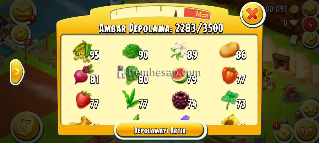 Hayday 115 lvl 3400 ağıl 3500 ambar 500 tl