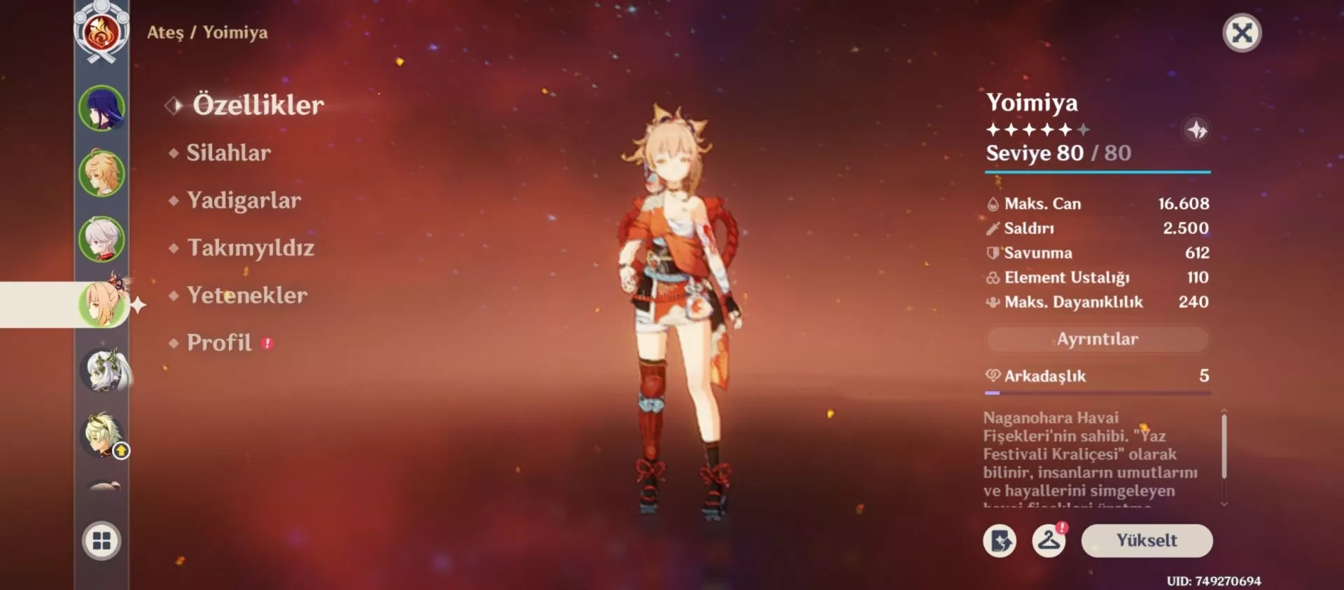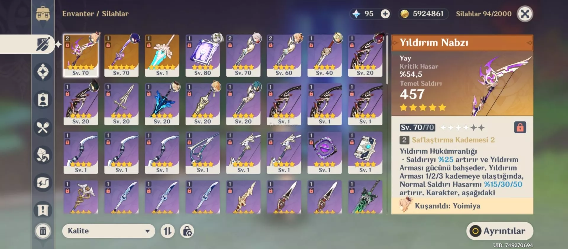 Hasapta raiden + imza silahı, yoimiya + imza silahı vardır. C6 Bennett vardır. Nahida,chasca,kazuha,tighria vardır. Mondstadt %75, liyue %87, inazuma %100, sumeru %100, fontaine %64, natlan %13.