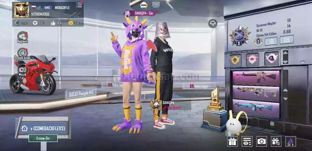 9 geliştirebilir 2 si ölum mesajli 30 destansı toplam 150 silah skini 1 nihai ducatti motor 20 kask skini 25 canta skini 10 dan fazla araç skini 600 k populerlik