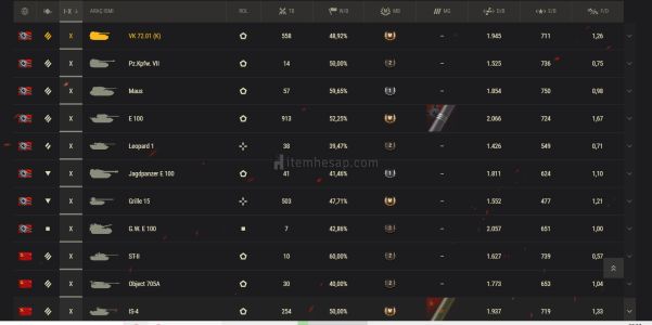 hesapta 277 tank var, 8 seviye premium ve 10 seviyelerin arayüzden ekran görüntülerini aldım, daha 7 seviyede falan da pre tanklar var, isveç ,çek cumhuriyeti,italya,almanyadan da bir kol açık,çoğu dal tamamdır.hesap zaten premium tank dolu parayı da rahat kasarsınız,hem kasmak için devam edebilirsiniz,hemde direkt bir klana başvurup klanın kıdemlisi olabilirsiniz,hesap zaten full klan savaşları için hazır, ben her şeyi söyledim,sormak istediğiniz soru varsa 05059040143^ten sorabilirsiniz,ancak satış güvenli olması açısından buradan yapılacaktır.