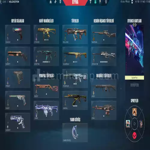 ⭐Hesapda 3 vandal(2023 Champions,İyon Vandal)⭐,2 Spectre(Afet Spectre,Yıldız Serüveni),⭐2 Operatör(Yağmacı Op.,İridyum Kesi Op.),⭐2 Phantom(Radyant Krizi,Aztek Güneş Taşı),⭐2 Ghost,⭐1 Sherıff,⭐0 Outlaw⭐2 Marshal,⭐1 Classic,⭐1 Shorty,⭐0 Frenzy,⭐0 Ares,⭐1 Strınger,⭐1 Buldogg,⭐2 Judge,⭐1 Odin,⭐1 Bıçak,⭐2 Bucky,⭐2 Guardıan vardır.⭐hesaba 2 Tane Battle Pass Açılmıştır⭐