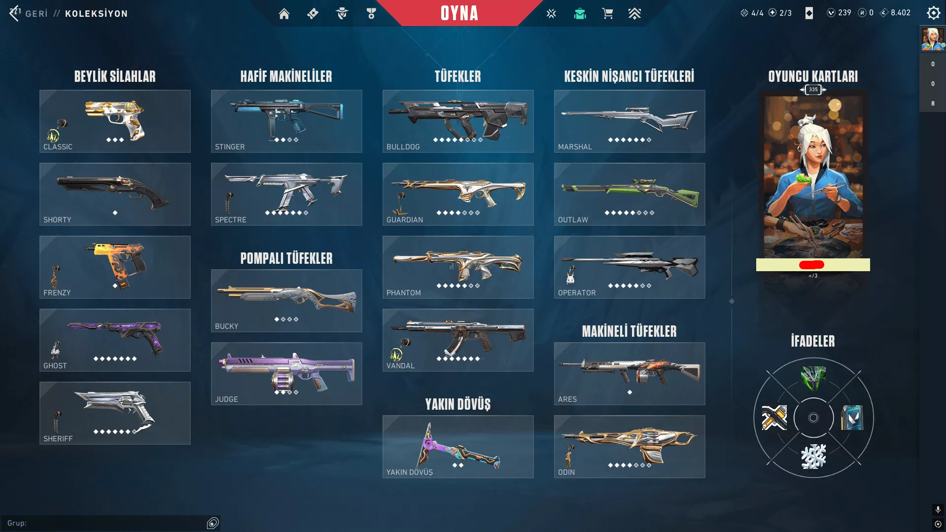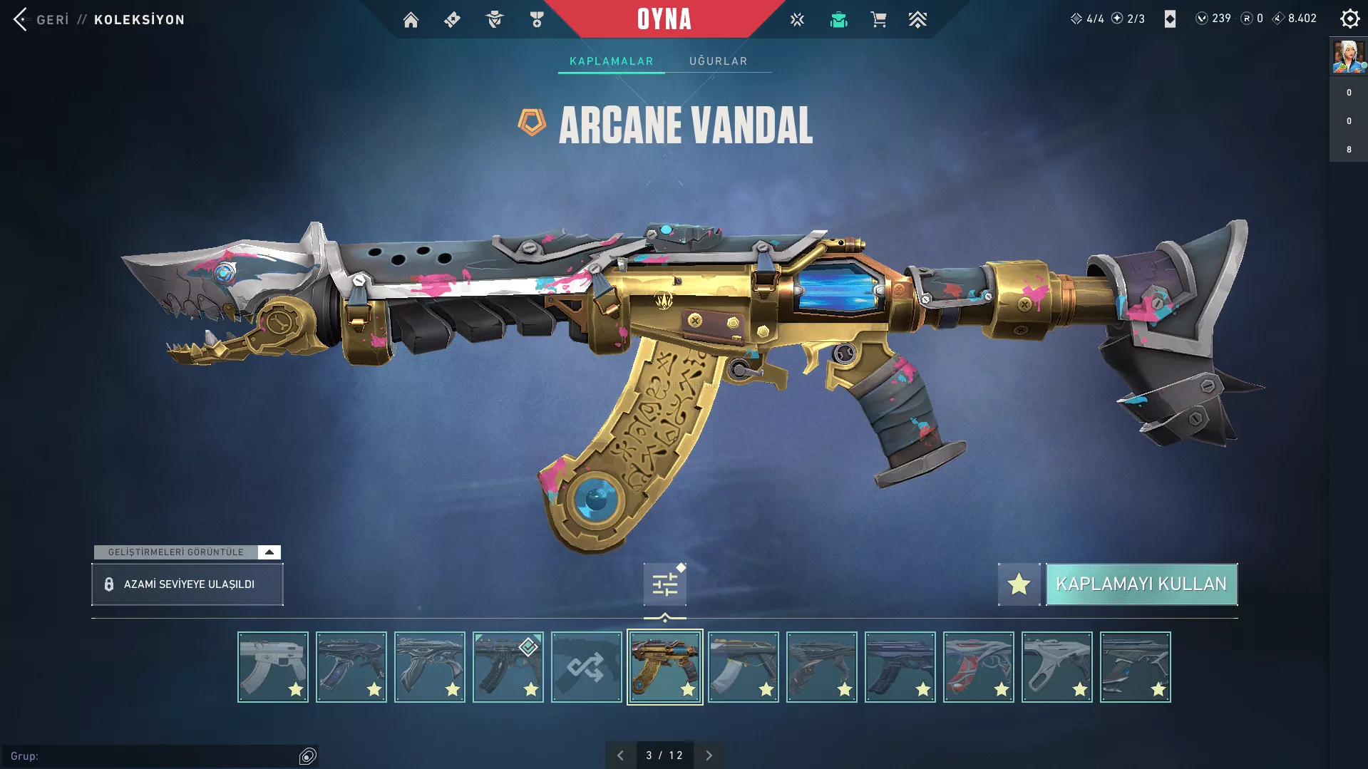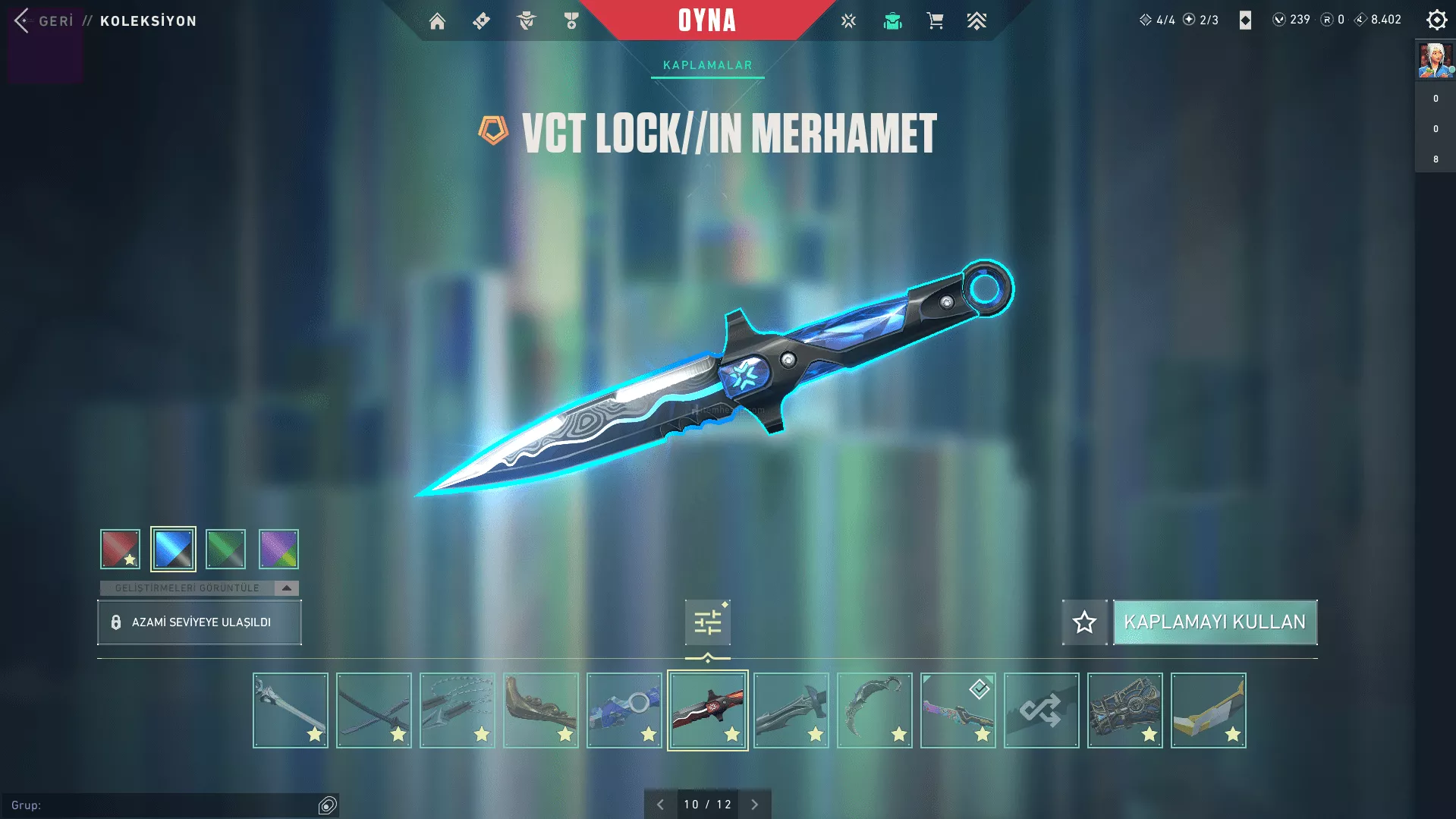 Bıçaklar : Arcane Eldivenleri, Asil//2.0 Karambit, Delipop Balta, Evori'nin Büyülü Asası, EX.0 Kılıcı, Kuronami No Yaıba, Semavi Yelpaze, Valorant GO!1. Cilt Bıçak, VCT LOCK//IN Merhamet, Yağmacı Bıçak, Yağmacı Karambit 8 BP Bıçak
